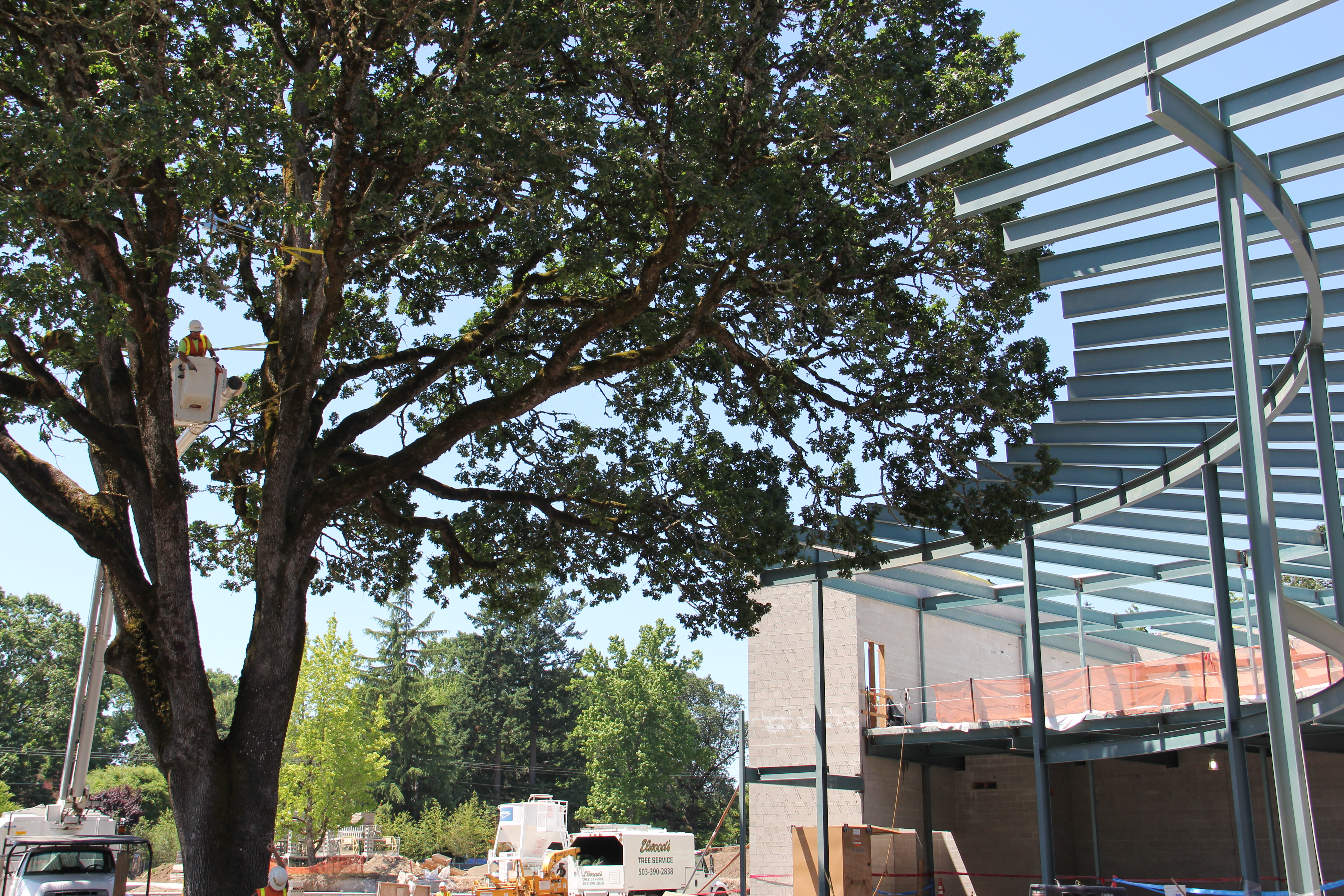 Elwood’s Tree Service of Salem is doing the tree removal. Preservable wood from the tree will be sent to Zena Forest Products, which specializes in refurbishing white oak wood for sustainable flooring and lumber.